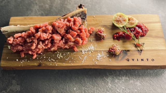 - Tartare al coltello, senape antica e frutti rossi servita su ossa con midollo