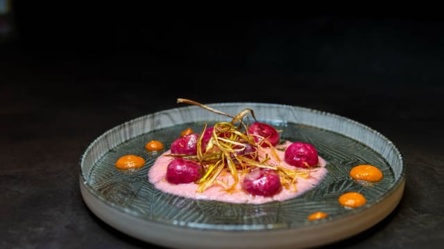 - Gnocco ripieno ai funghi porcini, salsa delicata e jus di manzo, pepe timut