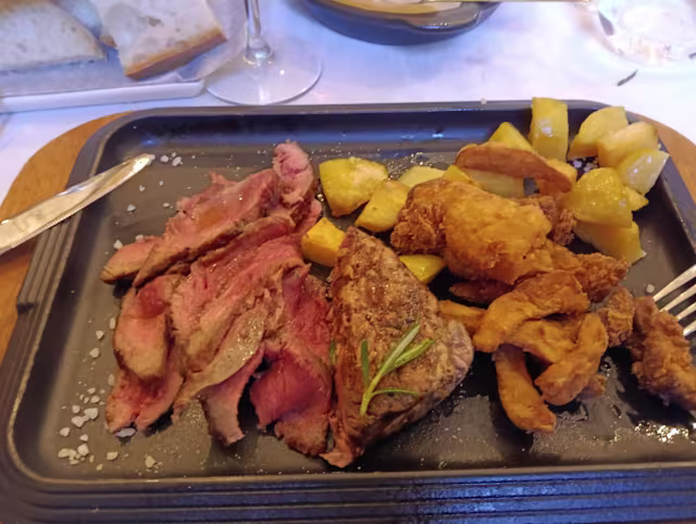- Tagliata di controfiletto di manzo (circa 150g) con rucola, pomodorini e scaglie di grana e patate al forno