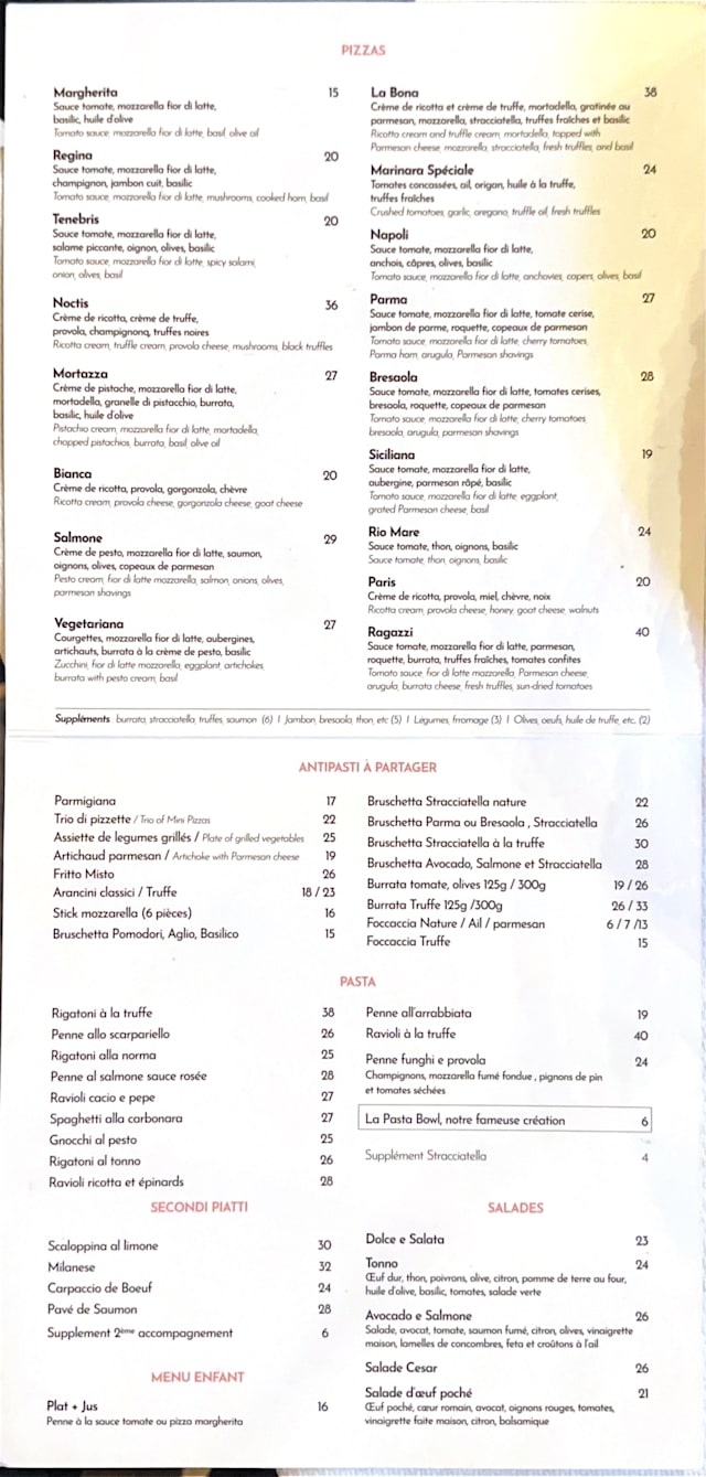 10/10We had a pizza and pasta bread bowl. Absolutely 💯 the best Italian I have ever had! The pizza was so yummy and very popular. Almost everyone in the restaurant had at least one pizza on their table. If I remember correctly, they had over 10 different kinds to choose from. About the pasta bread bowl, I didn't realize I had to choose the type of pasta I wanted in the bread bowl (because the menu was in French and Google translate didn't translate the instructions). So, when she asked me what type of pasta I wanted I was lost. She was very kind and recommended a pasta and I agreed (not completely understanding what she meant). I am so glad I did! It was Divine!! My recommendation is (if you don't understand the menu) just close the menu, tell the server what you like and ask for her recommendations. I promise, you will not be disappointed! Promise!
