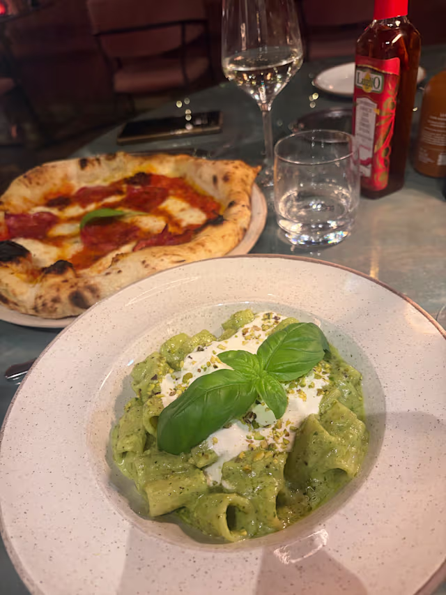 - Crème de pistache, mozzarella fior di latte, mortadella, granella di pistacchio, burrata, basilic