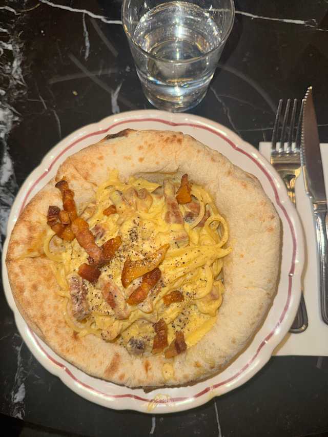 - Crème de ricotta et crème de truffe, mortadella, gratinée au parmesan, mozzarella, stracciatella, truffes fraîches et basilic