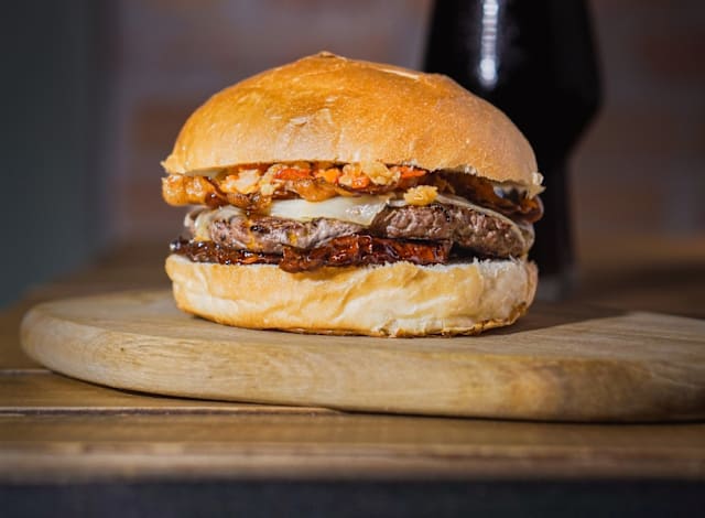 Buns artigianale, hamburger di chianina bio 150gr, caciocavallo, pancetta arrostita lattuga, pomodoro, salsa burger
