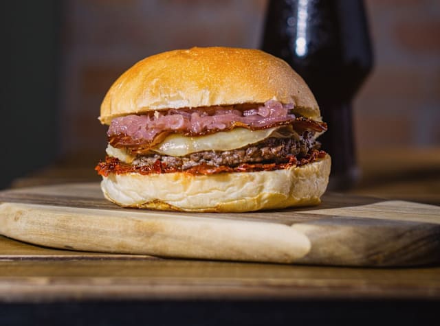 Buns artigianale, hamburger di chianina bio 150gr, pecorino fresco, guanciale, pomodori secchi, stuzzichella
