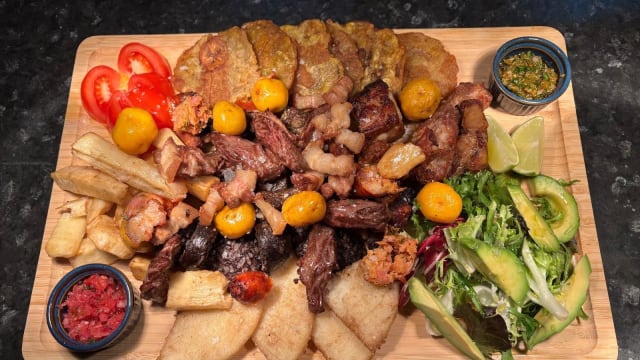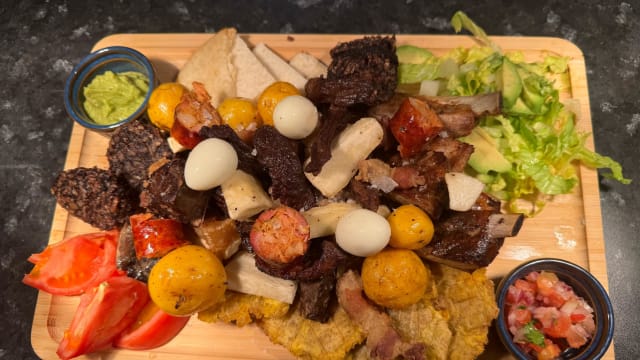 Costilla, chicharrón, ternera, chorizo, bofe, patacones, yuca, papa criolla, arepa, tomate, huevos de codorniz y lechuga