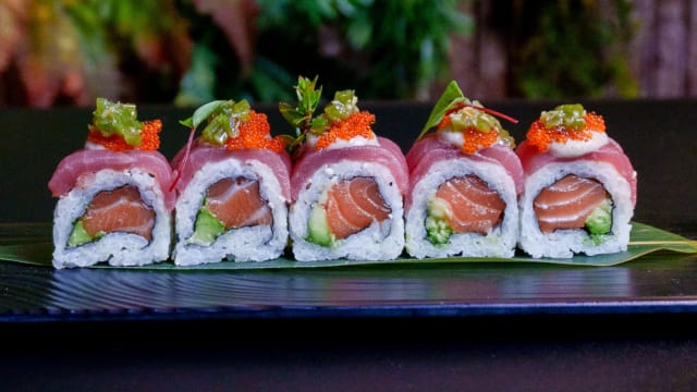 Uramaki salmone e avocado, con all’esterno carpaccio di tonno, crema di patate, acciughe aromatizzate al tartufo, fobico e wasabi fresco