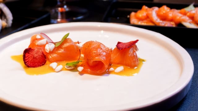 Sashimi di salmone allo zafferano condito con salsa teriyaki