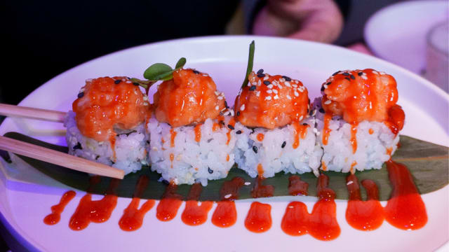 Maki con ripieno di gambero fritto, avocado, tartare di salmone, conditi con maionese piccante, pasta kataify e salsa teriyaki