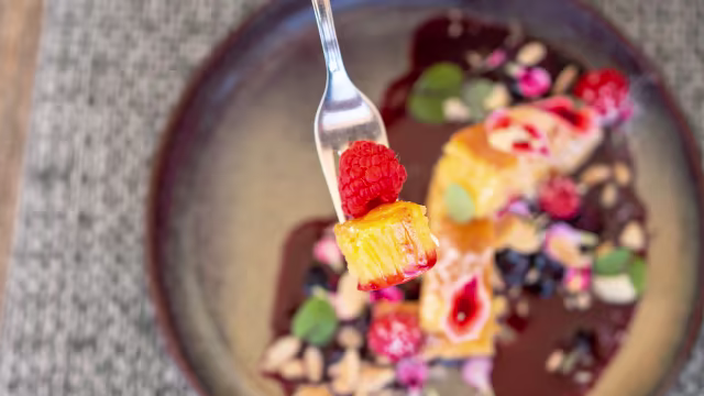 - Quindim de amêndoa com Framboesas