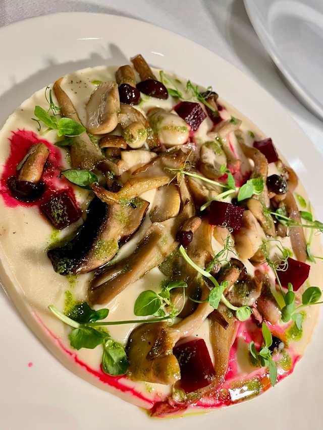 Servita su crema di pastinaca con barbabietola marinata e olio al basilico