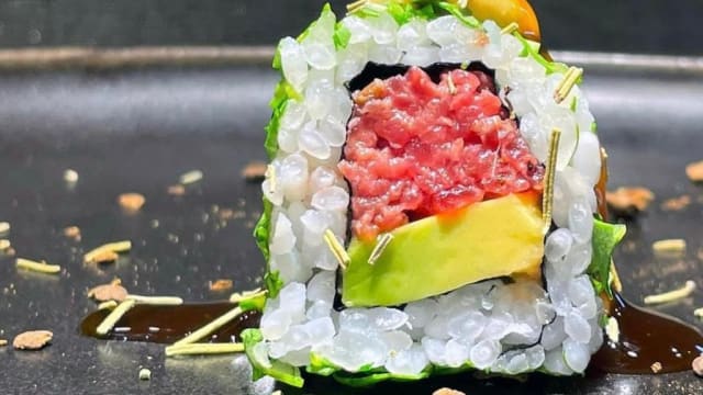 Uramaki cotto al forno con avocado, battuto di salmone con scalogno, salsa piccante, teriyaki e tonno essiccato otto mesi