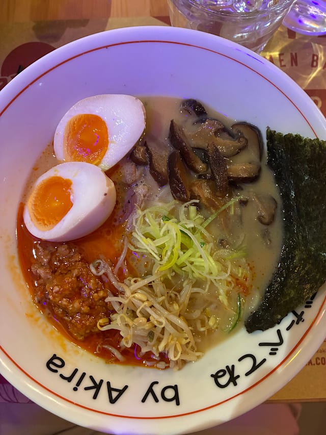 - Noodles fatti in casa, brodo di maiale, 1 fettina di carne di maiale, miso, salsa spicy, germogli di soia, porro, alga nori