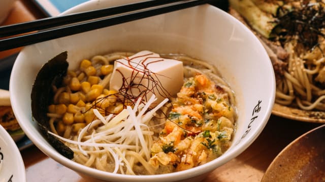 Kombu, olio di porro, salsa shio, spinaci*, porro, mais, ½ uovo sodo, kakiage* (tempura di verdure), alga nori
