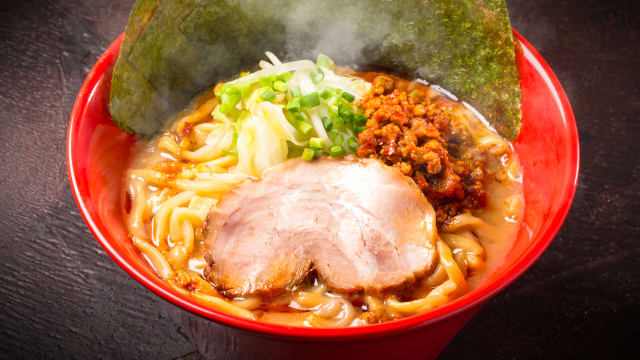 Noodles fatti in casa, brodo di maiale, fettina di carne di maiale, miso, salsa piccante, germogli di soia, cipollotto, alga nori.