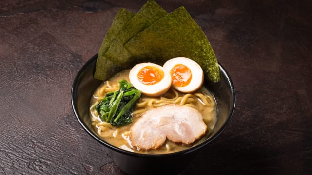 Noodles fatti in casa, brodo di maiale, fettina di carne di maiale, salsa shoyu (a base di soia), uovo sodo, cipollotto, alga nori.