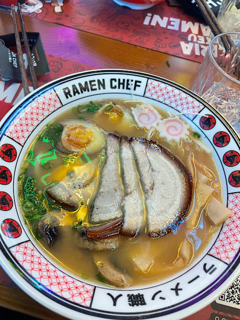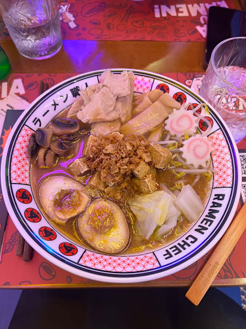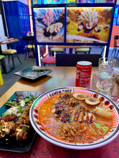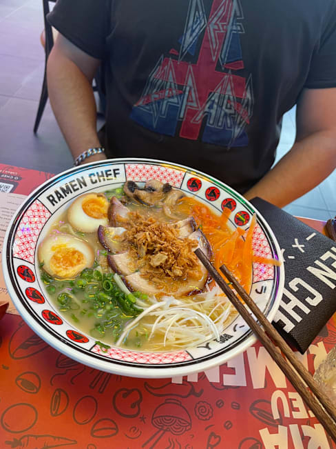 9/10Great atmosphere for the kids with the manga themes and the robot running around. The food was surprisingly good. While the shoyu broth might not be the richest and most refined I have had, the noodles were on point and the toppings were fresh. I like the fact you can build your own. Its a really fun place.