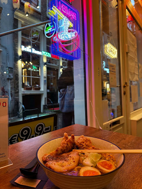 Thank you for your kind words. We are glad you enjoyed the plant-based ramen and atmosphere, and we hope to see you again soon in Amsterdam.