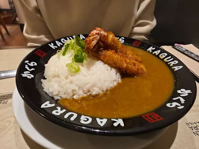 - Arroz con curry japonés acompañado de hamburguesa de langostino y langostino con panko crujiente