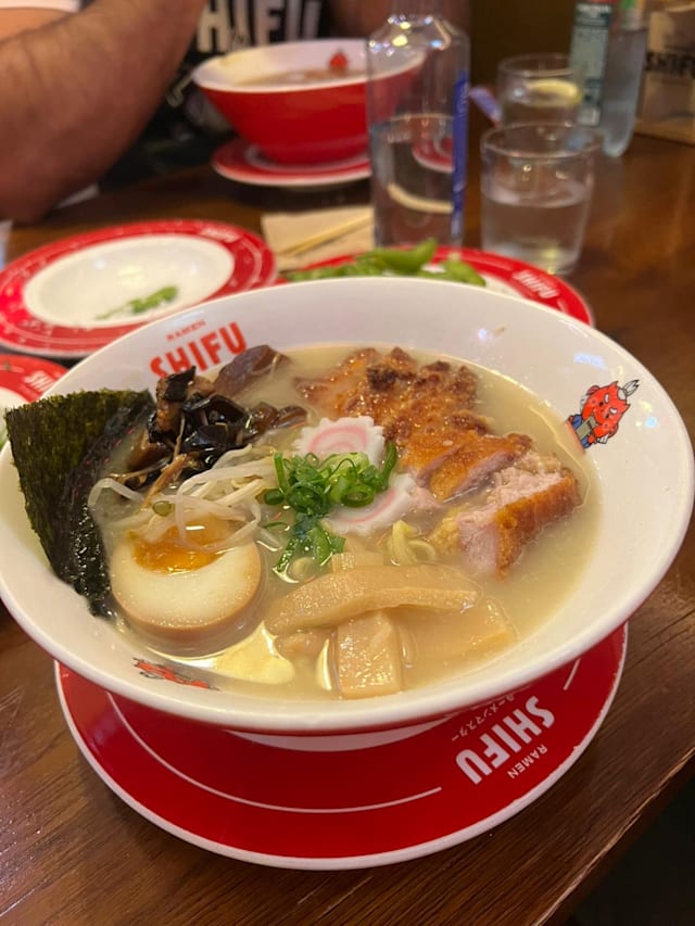 6.5/10The starters were served at the same time as the Ramen although the waiter had said they would be served before. So we had no time to enjoy the starters which were hotter than the ramen. The miso Ramen was a bit heavy for my taste, I prefer a lighter broth. The ramen dish wasn't warm enough. The service was friendly, strangely even more so after we tipped.
