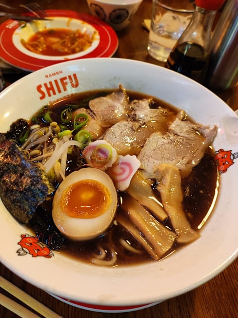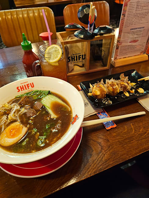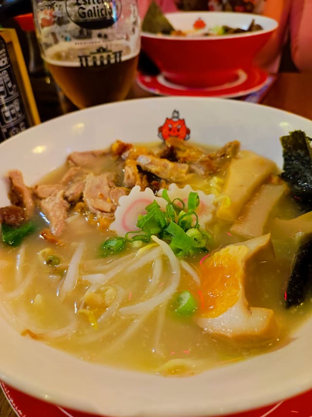 9.5/10Excellent ramen restaurant in the center of Madrid. The service was quick and friendly at all stages, even when the restaurant was busy. The portions were all very reasonable. And most importantly, everything that we got (takoyaki, edamame, ramen) was quite tasty. The only thing to note would be that the tables are a bit small. At one point, between the menus, drinks, and food, we barely had room left. But it's a small minus.