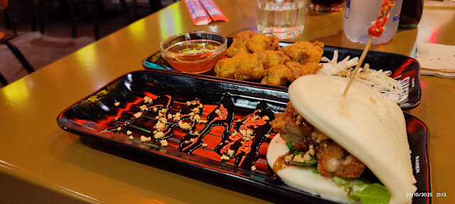 Bao bun relleno de pollo empanado crujiente, cacahuetes y canónigos, servido con salsa tonkatsu.