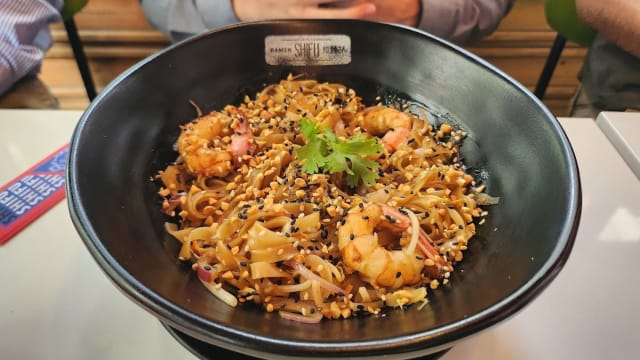 Tagliatelle di riso con arachidi, salsa thai, uova , germogli di soia, sesamo bianco e nero, coriandolo, lime