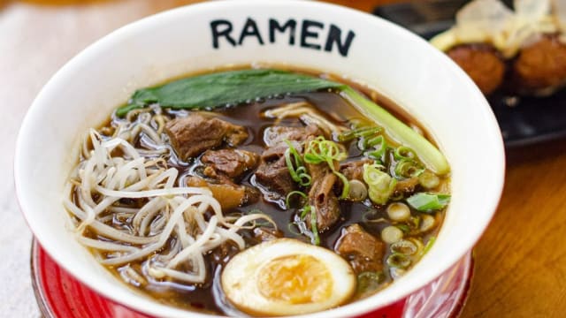 Noodles with stewed beef, pak choi, bean sprouts, egg and chives, served in their own homemade broth with shoyu. Mildly Spicy.
