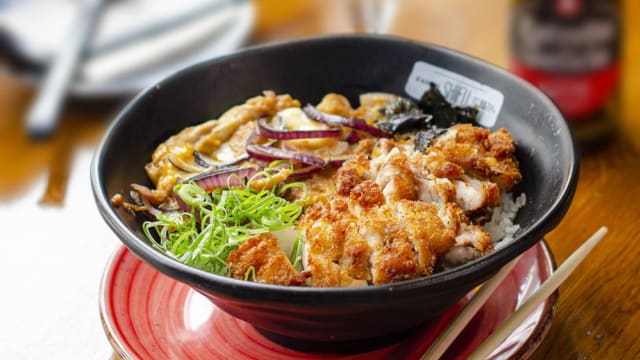White rice served with crispy chicken fillet, scrambled eggs, chives, red onion and nori seaweed.