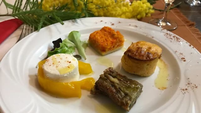 Sformato di zucchina verdura di stagione con crema di blu di normandia e gocce di olio extra vergine d’oliva