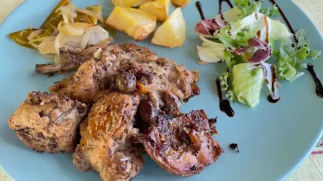 Coniglio sfumato col pigato, pinoli e olive taggiasche