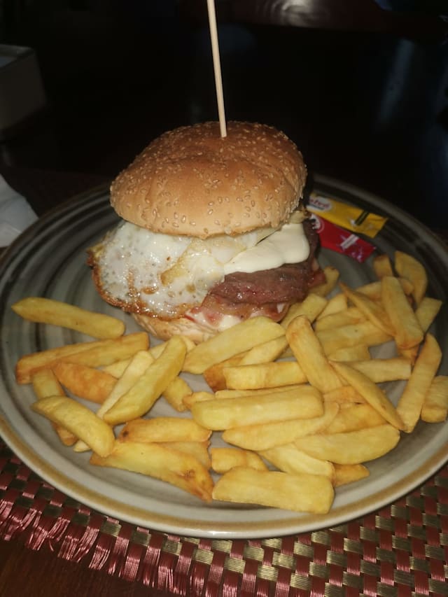 - Hamburger pomodori, cipolla, salsa piccante, uova, maionese, insalata, pancetta fontina, salamina, peperoni grigliati con contorno di patatine fritte