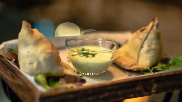Buñuelo de verduras, patata y paneer, en suave salsa de leche de coco y almendras.