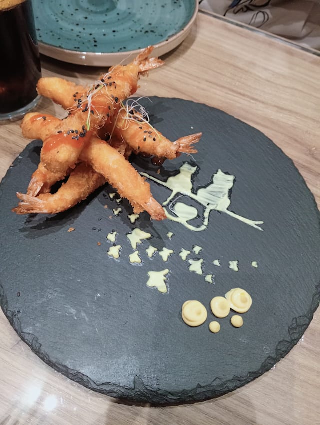 Arroz basmati con langostinos, azafrán, cardamomo, tomate, jengibre y otras especias, cocinado a fuego lento.