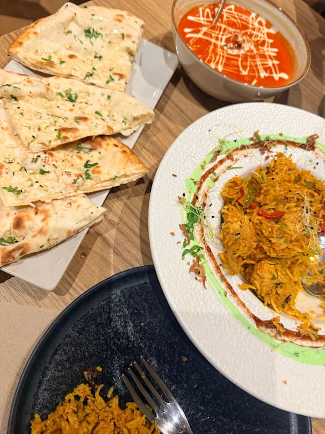 Arroz basmati con pollo, azafrán, cardamomo, tomate, jengibre y otras especias, cocinado a fuego lento.