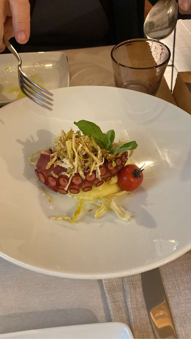 - Tentacolo di polpo* a vapore su schiacciatina di patate aromatizzata agli agrumi