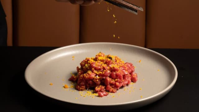 Tartare di bovino battuta al coltello e condita con capperi, cipolla rossa, cetriolo agrodolce, senape in grani e bottarga di cortile