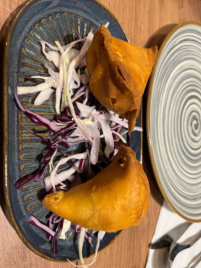 Flaky, deep-fried dough pockets filled with spicy potatoes, a classic Indian street food.