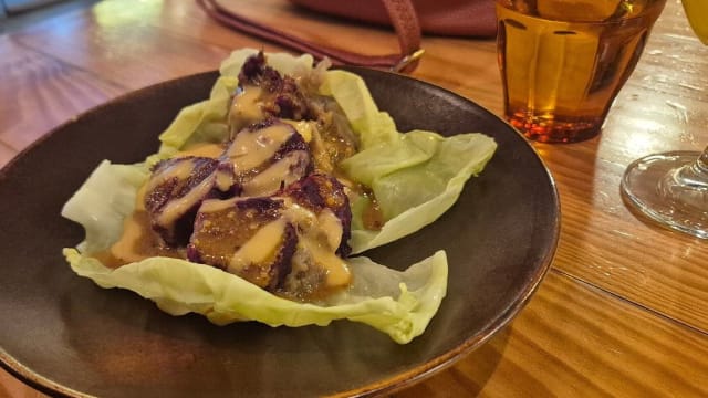 De lechuga de mar, salsa tártara, calabaza, ajos tiernos, alcaparras fritas, hoja de rocío