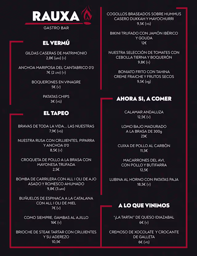 Rauxa es un restaurante acogedor especializado en tapas y platillos elaborados con producto de calidad y sabores auténticos. Ofrecemos una cocina pensada para compartir, en un ambiente cercano y agradable, ideal para disfrutar con amigos o en pareja. Buena comida, buen ambiente y una experiencia gas...