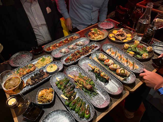 - yakitorispett, king-oyster svamp, oxfile, negi niku, kimchisalad, haricots verts, spetskålsalad, padrones.