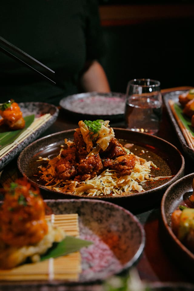 - Crispy chicken, spenat, potatiskrisp, teriyakiglaze