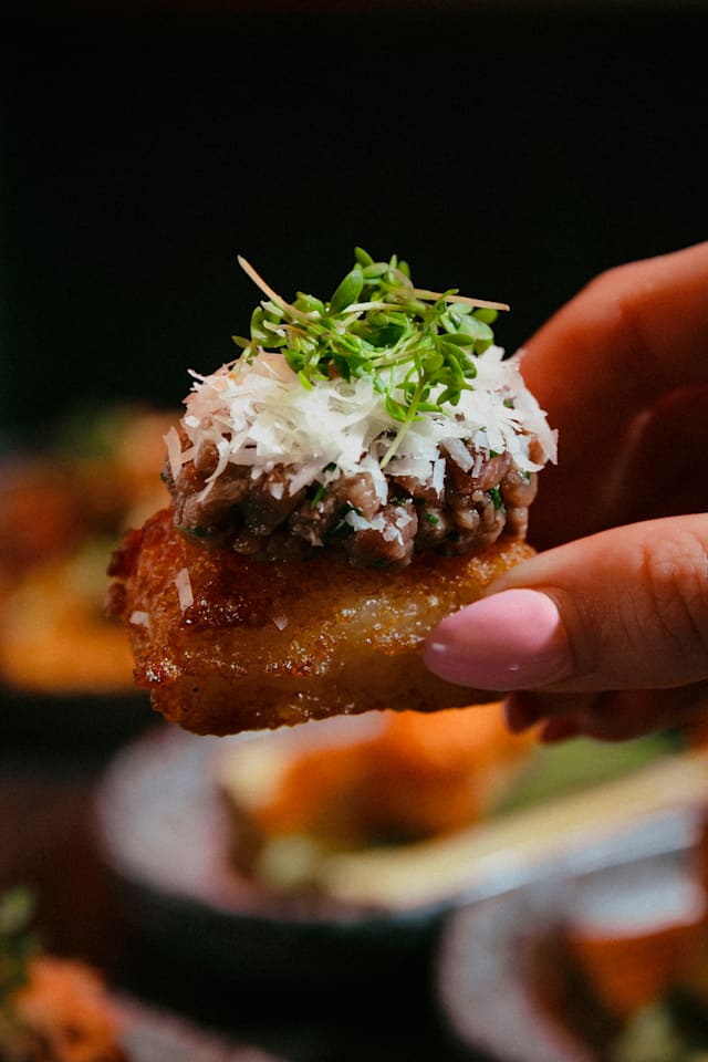 - 2 st crispy rice, 2 st nori taco, yuzu infused cucumber, ra ws kimchi