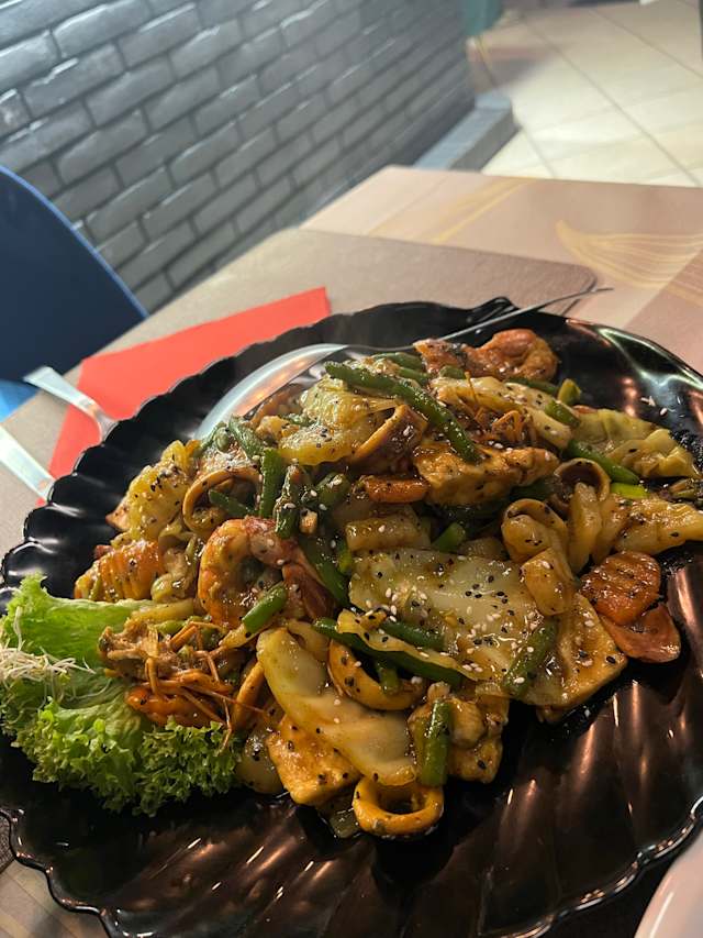 - Calamari fritti saltato con cipolla, peperone corno chiaro, salsa di soia, ketchup, salsa di ostrica, peperoncino, pomodori, aglio e zenzero