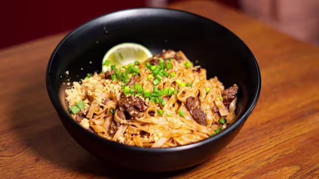 - Nouilles de riz plates sautées au wok, cacahouètes, pousses de haricot mungo, citron vert et ciboulette thai.