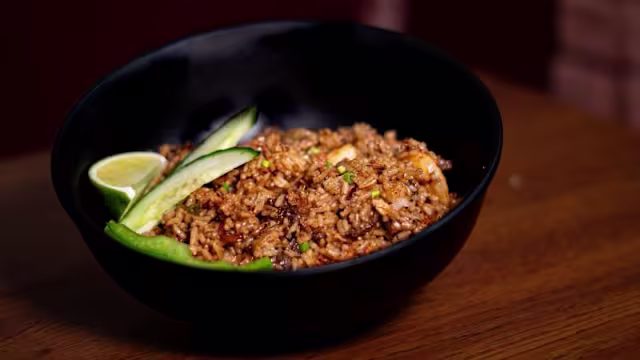 - Émincé de bœuf, crevettes, riz blanc parfumé, pousses de haricot mungo et carottes sautées au wok, oignons frits et ciboulette thai.