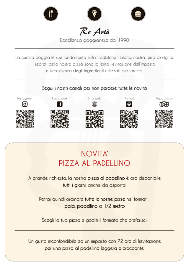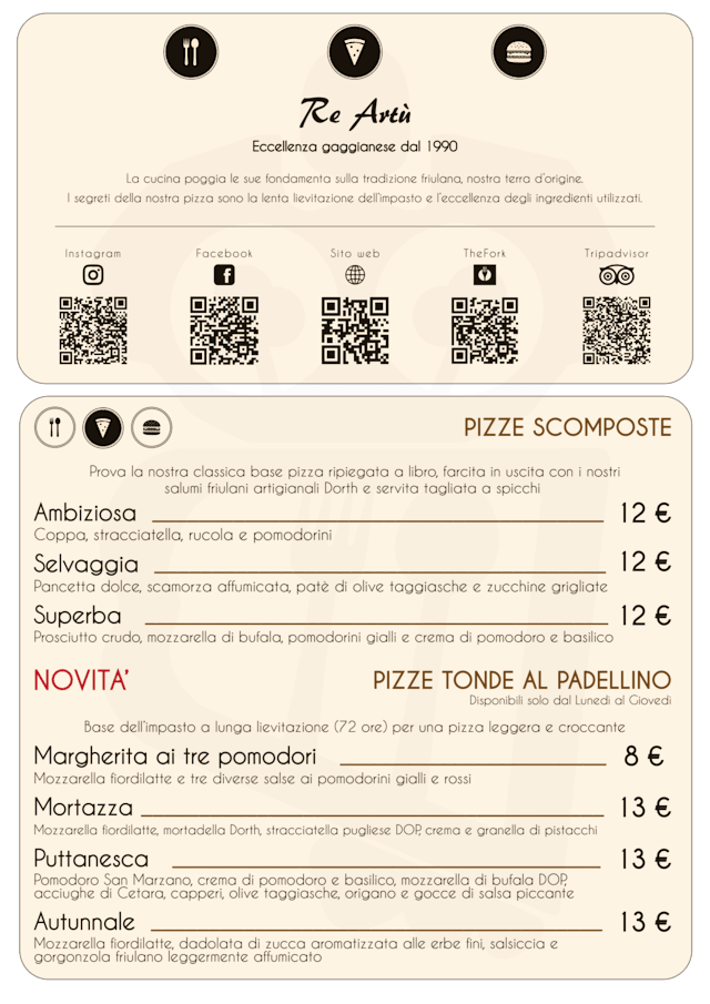 10/10Very good restaurant in Gaggiano. If you want to eat a very good pizza you have to go to Re Artu' but only for pizza. the first plates (pasta, rice) very good and also meat.