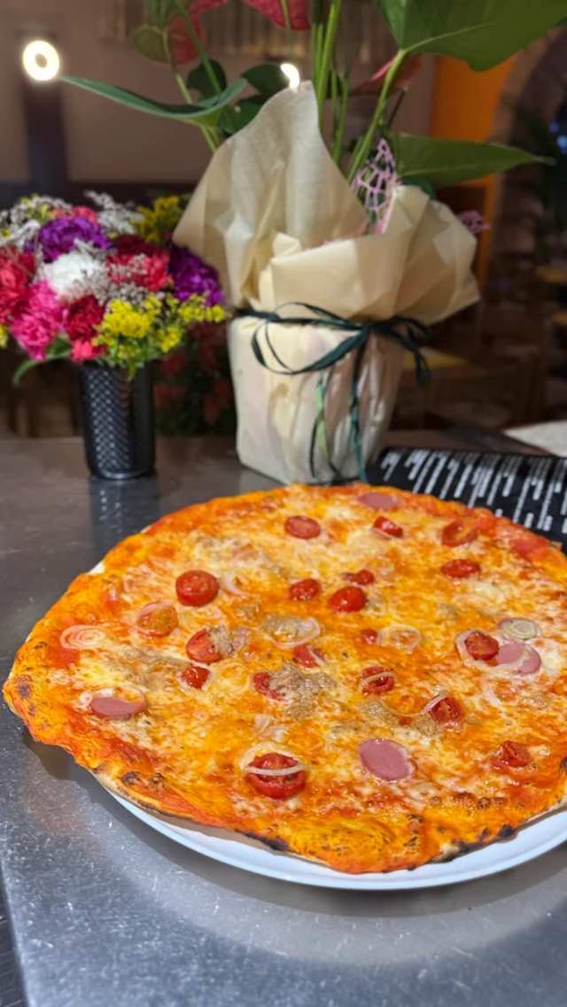 - Pomodoro, mozzarella, prosciutto, funghi, carciofi, olive