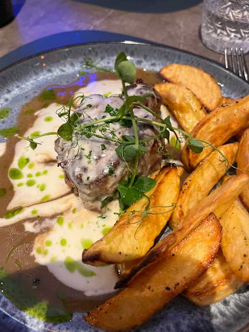 6.5/10This restaurant was highly recommended and nearby so we made a reservation for 7:15 and showed up at 7. They immediately seated us along with another couple. They didn't have the hamburger my husband wanted so he went with the steak, and requested medium for doneness. The steak was not medium, but more like the Florentine raw, and it didn't have the spices to make it taste good. It was cool and he didn't enjoy it. The chips were okay he said. I had the sea bass and salad and they were good although the fish wasn't fully done to the tail. Then we decided to have dessert but they didn't have the one we requested, and only 2 out of the four offered. We didn't have dessert. I admit we are the most obliging customers and my husband will not send unacceptable food back, he just muscles through, so they really didn't have an opportunity to make things right, but not having food offered on the menu (twice) and not preparing what we ordered was frustrating. It was a disappointing experience.