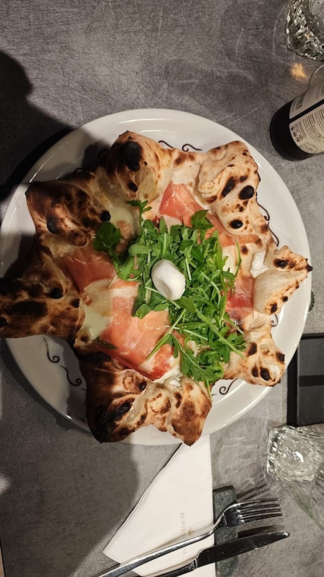 Cornicione ripieno di ricotta di bufala campana, mozzarella di bufala campana dop, culatello irpino del “prosciuttificio ciarcia”, rucola e olio EVO