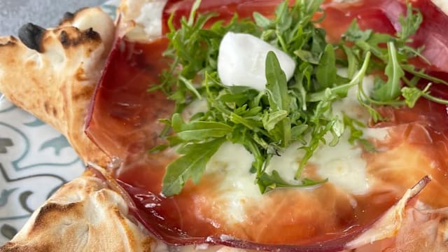 Fior di latte dei monti lattari, rucola, fiocco di prosciutto del “prosciuttificio ciarcia”, basilico e olio EVO